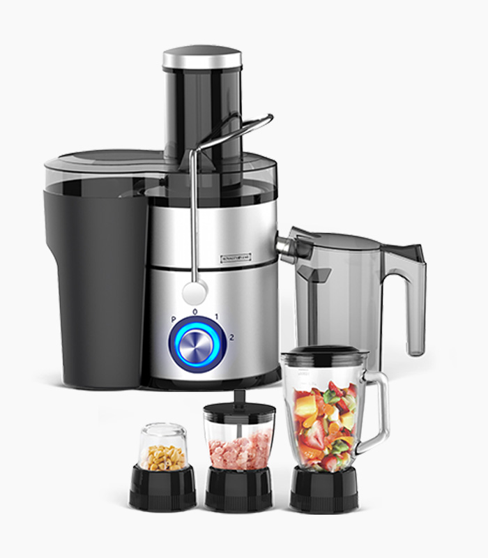 Osim funkcije sokovnika zajedno s ovim multipraktikom dobijate i posude za mljevenje, blendanje i sjeckalicu. S ovim funkcijama možete se bez napora suočiti s raznim kuhinjskim izazovima. Priprema smoothie napitaka, umaka od sjeckanog povrća i mljevenje začina nikad neće biti lakša i jednostavnija.