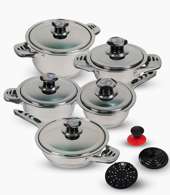 Set je napravljen od kvalitetnog nehrđajućeg čelika. Ručke su od silikona kako bi bez problema mogli da rukujete s vrućim šerpama i tavama bez straha da se opržite.